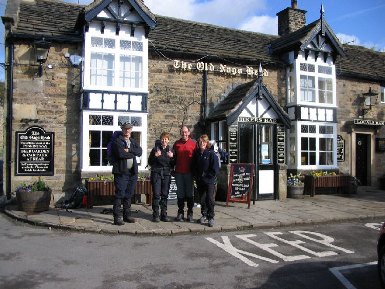 Wednesday 3rd May 2006 A really excellent start to our walk. The day dawned sunny and warm and after a breakfast of Peter’s lovely porridge we were into the taxi and off to Edale and on to the Pennine Way hoping that all the planning was OK. We all weighed our rucksacks on Nicks scales at Calver and we were all carrying approx. 10 kg. It was 9.00 am as we arrived at the Nags Head pub and we had our obligatory photo shoot and then we were on our way. Jacobs Ladder was climbed with ease although we had to have a snack stop at the top. Very few people about but we did have a chat with a television reporter from Canada who was covering the Para games in Manchester. We then carried on to Edale Rocks and Kinder Downfall.