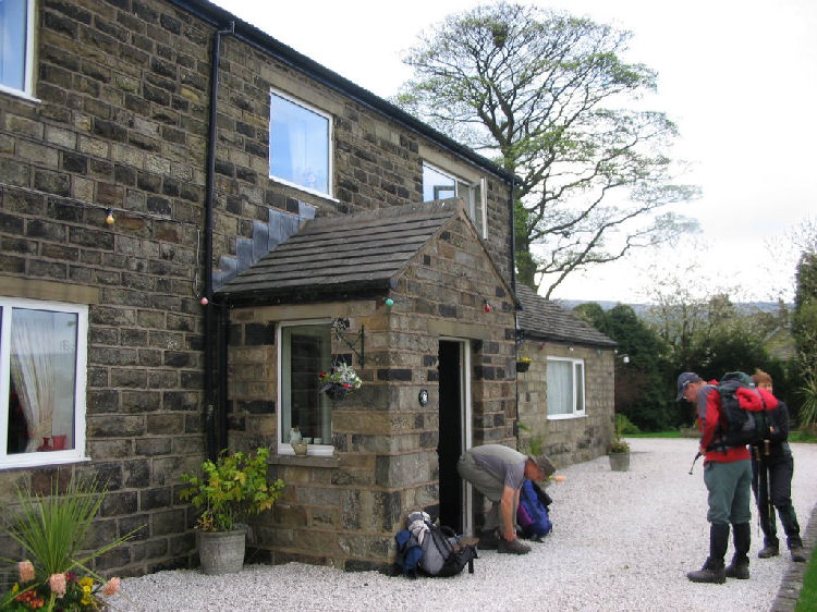 John was staying at Badgerfields as well that night and was able to give us the menu for the evening meal. Pat and Pete were also staying there but under canvas. We all joined up for the final couple of miles. I jokingly looked across the valley at a farmhouse high on the hill and said “that’s where we are heading” Teach me to be flippant because after crossing the canal we started one of the stiffest hills of the walk especially hard coming at the end of the day. The climb was worth it though as we were welcomed with pots of tea which we drank sitting in the garden. We were able to have some washing done which helped keep the smells down in the rucksacks. The meal was lovely (Salmon Thermidor) washed down with a bottle of wine. After the meal we sat in the summer house chatting and looking down on Huddersfield and the lights of the M62. A very good day